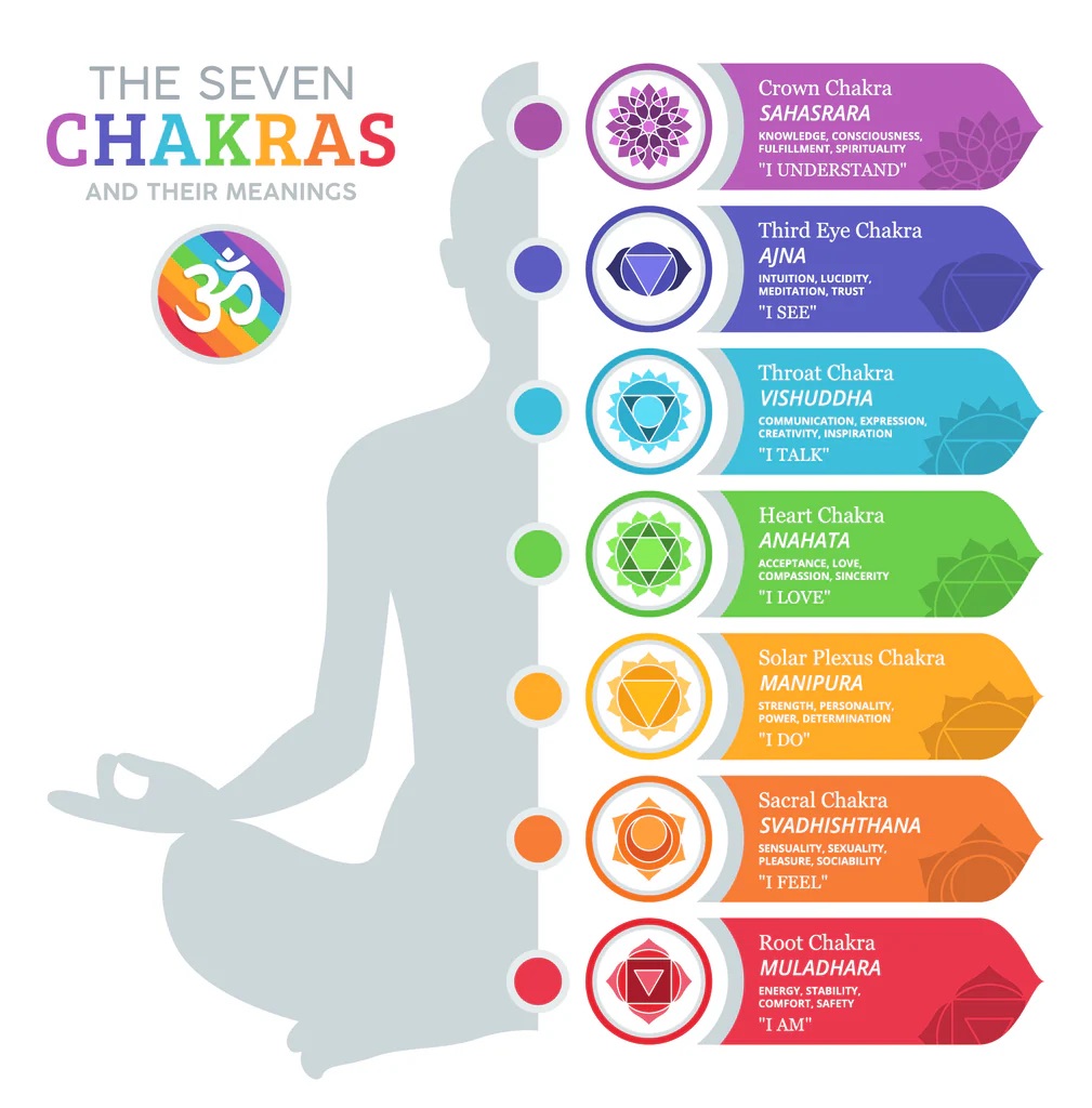 “Chakras are energy centers in the body, originating from Sanskrit for “wheel,” believed to influence physical, emotional, and spiritual health, with seven main points along the spine from the base to the crown, each associated with specific functions, colors, and sometimes symbols like lotuses, representing balance or blockage, a concept used in wellness practices like yoga for grounding and alignment. (Chakras Google Search).”